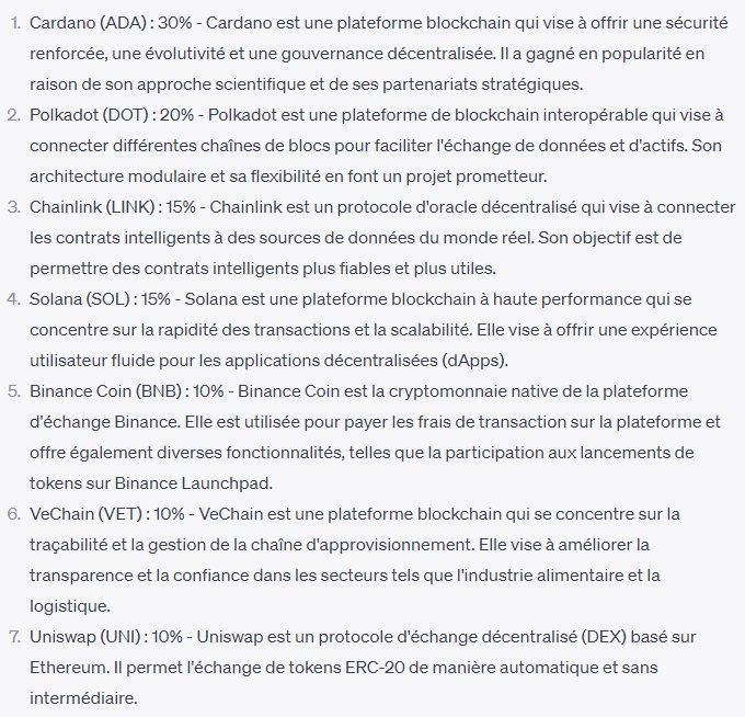 Comme nous avons pu le voir ci-dessus, ChatGPT allouerait 25 % de son capital dans des altcoins. Mais de quels altcoins peut-il bien s’agir ? A ce niveau, on remarque encore la précaution de l’IA au moment de placer son investissement. En effet, puisque les cryptomonnaies top 10 sont légions dans le portefeuille investissement.