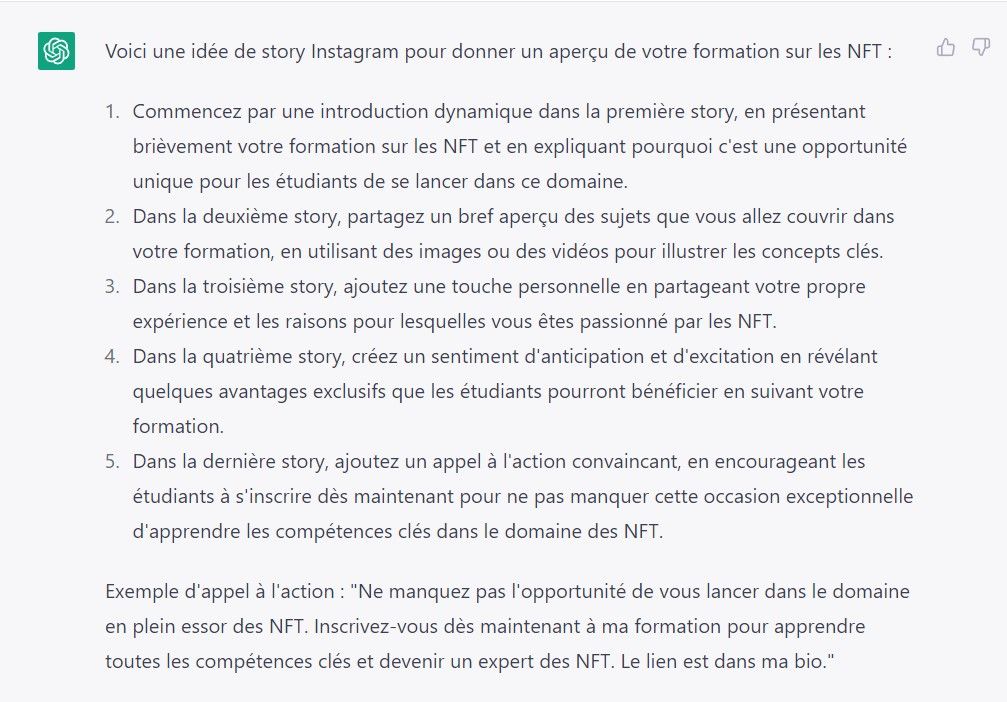 L’intelligence artificielle peut vous générer un script complet de story pour vos réseaux sociaux, en passant des arguments à soulever aux mouvements de caméra. A titre d’exemple, voici ce que ChatGPT nous a proposé pour faire la promotion d’une formation visant à expliquer 🤑 les principes des NFT Bitcoin et comment les utiliser.