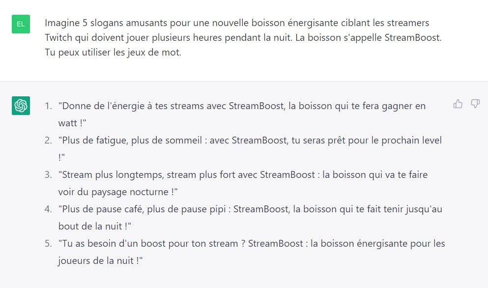 L’intelligence artificielle peut également vous fournir des slogans sur n’importe quel produit et sur n’importe quel ton. Voici, par exemple, ce que ChatGPT nous a proposé concernant une boisson énergétique imaginaire ciblant les streamers, intitulée StreamBoost.