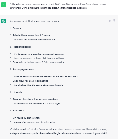 Si vous avez besoin de recettes saines incluant des aliments bénéfiques pour votre santé, spécifiez-le dans votre demande à l’intelligence artificielle et celle-ci vous fera quelques suggestions que vous pourrez affiner par la suite.
