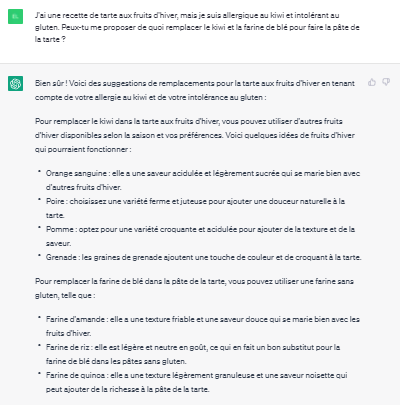 Si vous aimez une recette mais qu’un de ses ingrédients ne vous plaît pas, ou que vous souffrez d’une intolérance, ChatGPT peut vous proposer des alternatives.