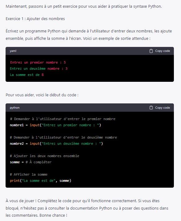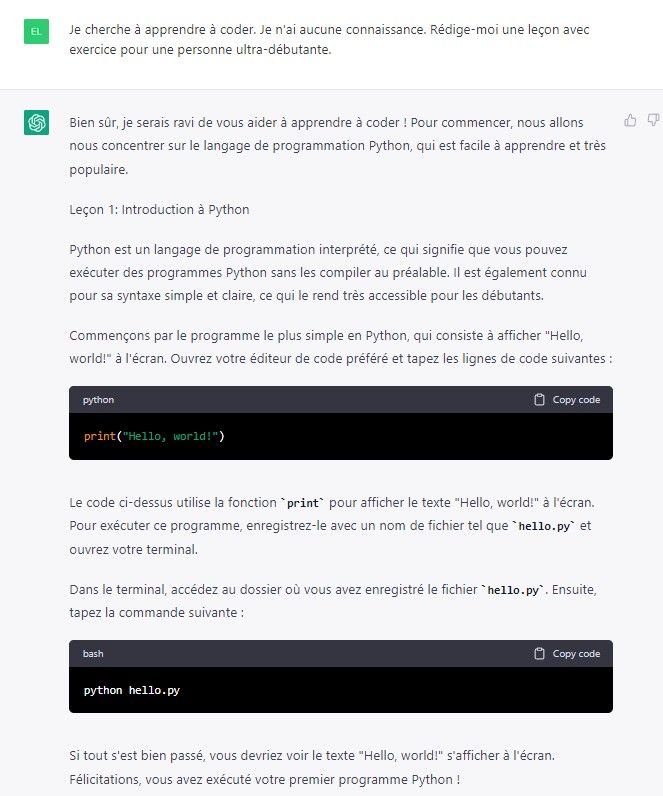 L’intelligence artificielle peut également servir à apprendre des choses aux utilisateurs qui le souhaitent. Voici la réponse apportée par ChatGPT lorsque nous lui avons demandé de nous apprendre à coder, dans un niveau pour grand débutant.