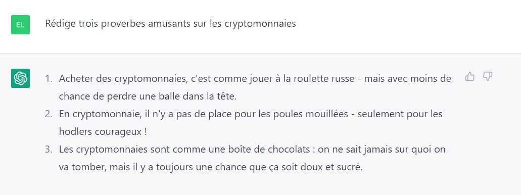 Au-delà des textes, ChatGPT peut s’avérer d’une grande aide pour vous aider à rendre votre texte plus amusant ou plus complet. Vous pouvez donc lui demander de rédiger des figures de style sur un sujet de votre choix, et même lui ordonner de vous fournir des proverbes.