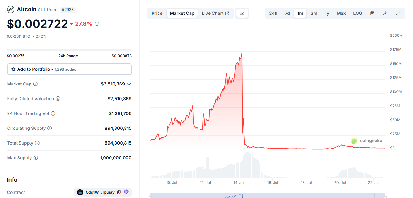 Le 14 juillet dernier, le prix de la crypto ALT s’est effondré de 0,19 $ à 0,003 $, faisant chuter la capitalisation boursière de 190 millions de dollars à seulement 3 millions de dollars.
