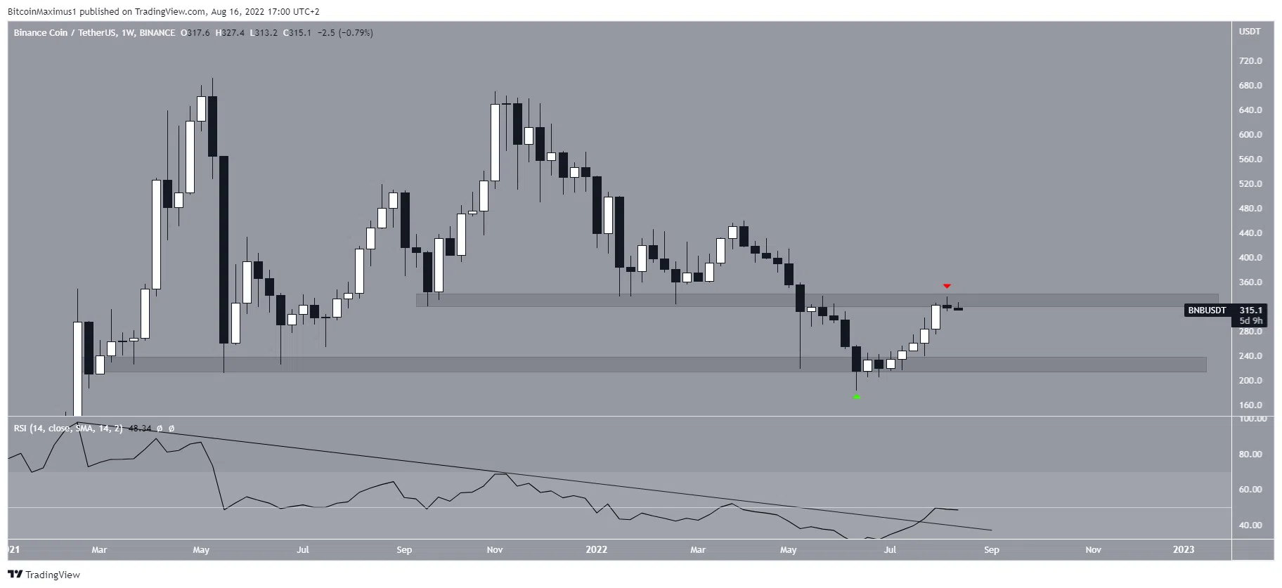 Binance Coin évolue principalement à la baisse depuis son sommet record de 691,80 $ atteint en mai 2021. Il a généré un sommet inférieur en novembre 2021 et a ensuite repris sa descente jusqu’à son creux de juin 2022, situé à 183 $.