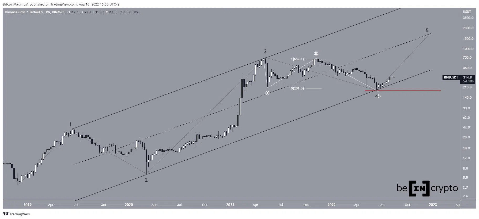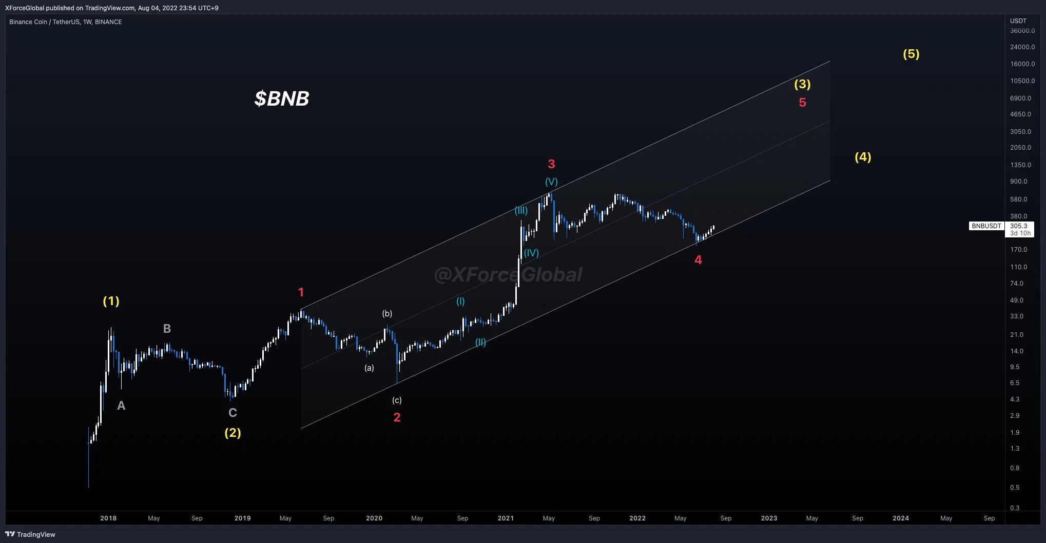 Le crypto trader @XForceGlobal a partagé sur Twitter un graphique du BNB, affirmant que le cours a probablement démarré une vague cinq de long terme, laquelle pourrait finir par le mener à un nouveau cours record.