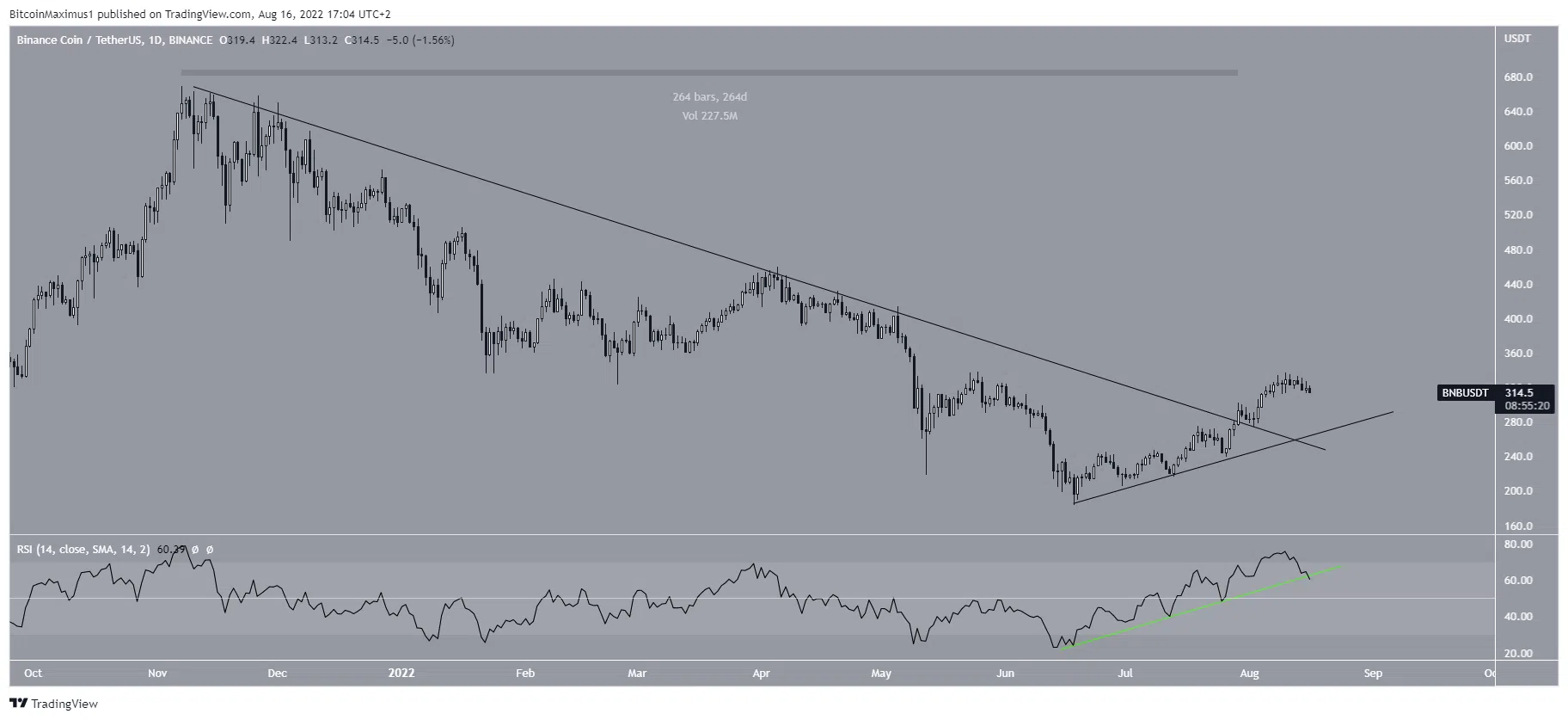 Le graphique quotidien montre également une perspective haussière, s’alignant avec les lectures du graphique quotidien. Le 29 juillet, Binance Coin a dépassé une ligne de résistance descendante en place depuis 264 jours. Cependant, la ligne de tendance ascendante du RSI (ligne verte) qui a accompagné cette hausse se trouve maintenant brisée.