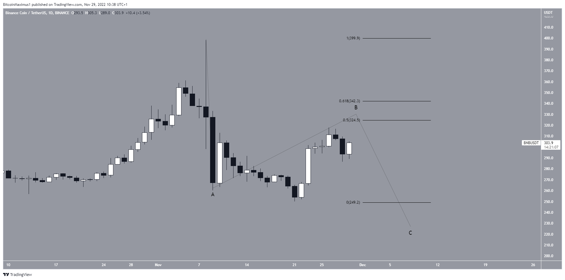 Une chute du cours sous le creux de la vague C (ligne rouge) situé à 250 $ annulerait cette prédiction haussière du BNB.