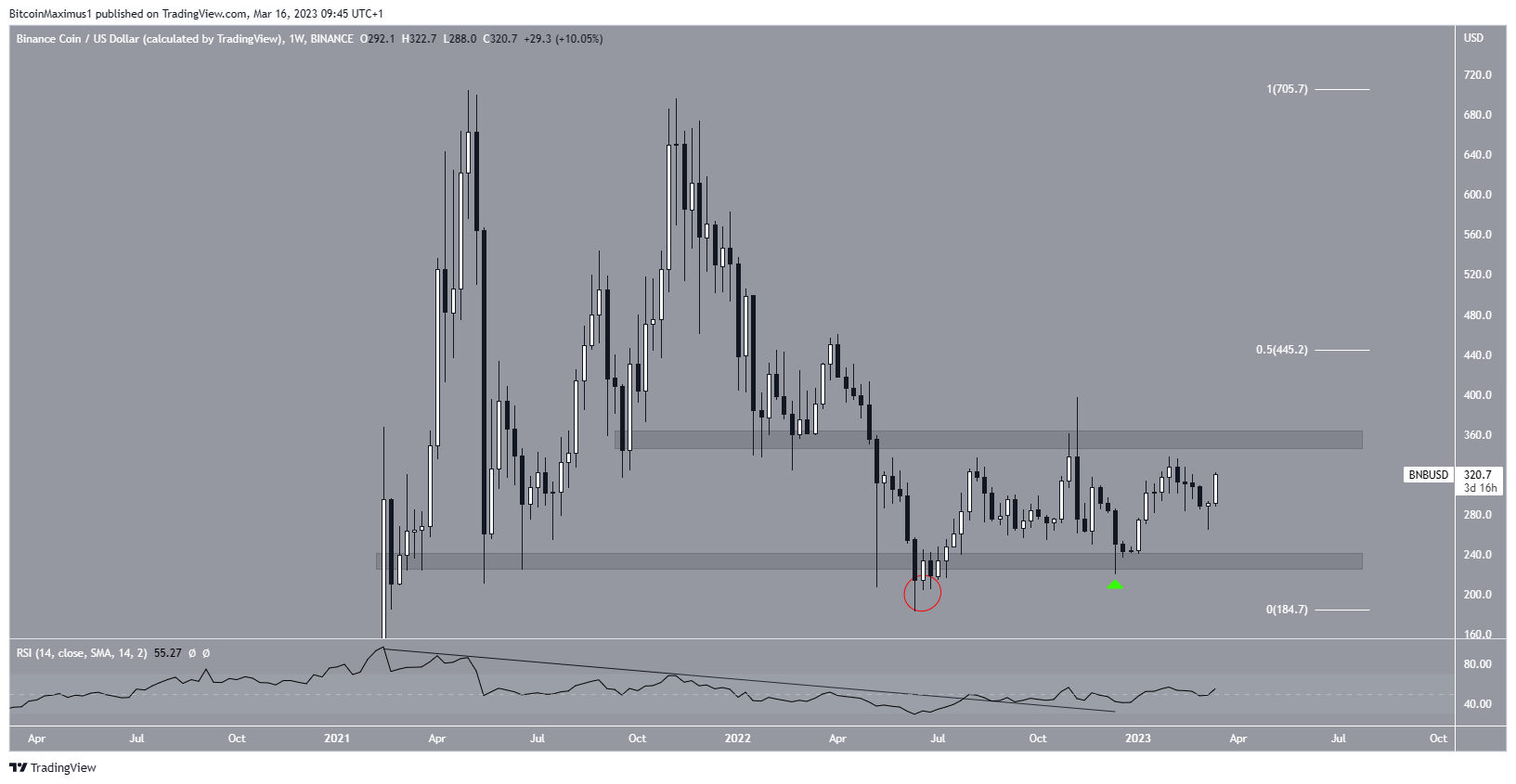 L’analyste technique des données sur la semaine montre une fourchette de long terme allant de 240 $ à 360 $. En dehors d’une déviation en mai 2022 (cercle rouge), le cours BNB évolue au sein de cette zone depuis avril 2022.