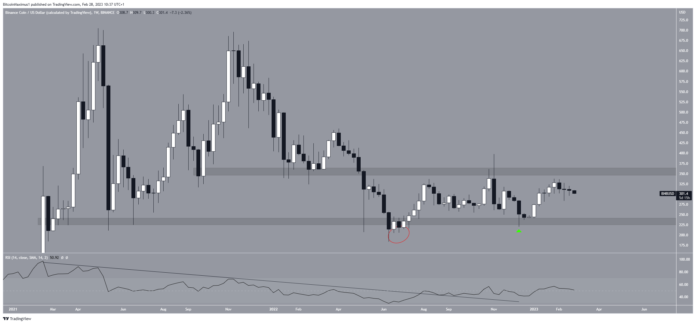 L’analyse technique des données hebdomadaires nous montre que 📈 le cours du BNB évolue dans une fourchette allant de 240 $ à 360 $ depuis avril 2022. Le cours a bien dévié sous cette fourchette en mai 2022 (cercle rouge), mais il l’a ensuite regagnée peu après.