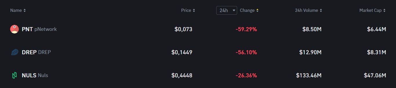 Si une annonce de listing à venir a bien souvent des conséquences très positives sur le cours d’une cryptomonnaie, c’est tout l’inverse qui se produit lorsque c’est un délisting qui est annoncé. Même si la soirée a été difficile pour le marché crypto, ces altcoins ont fait bien pire que tout le monde. Par exemple, le PNT et le DREP sont les deux grands perdants de la journée. Tous deux perdent respectivement 59,53 % et 54,75 %. Ils devancent largement le troisième perdant du jour sur Binance, le NULS, qui est en baisse de 26,36 %.