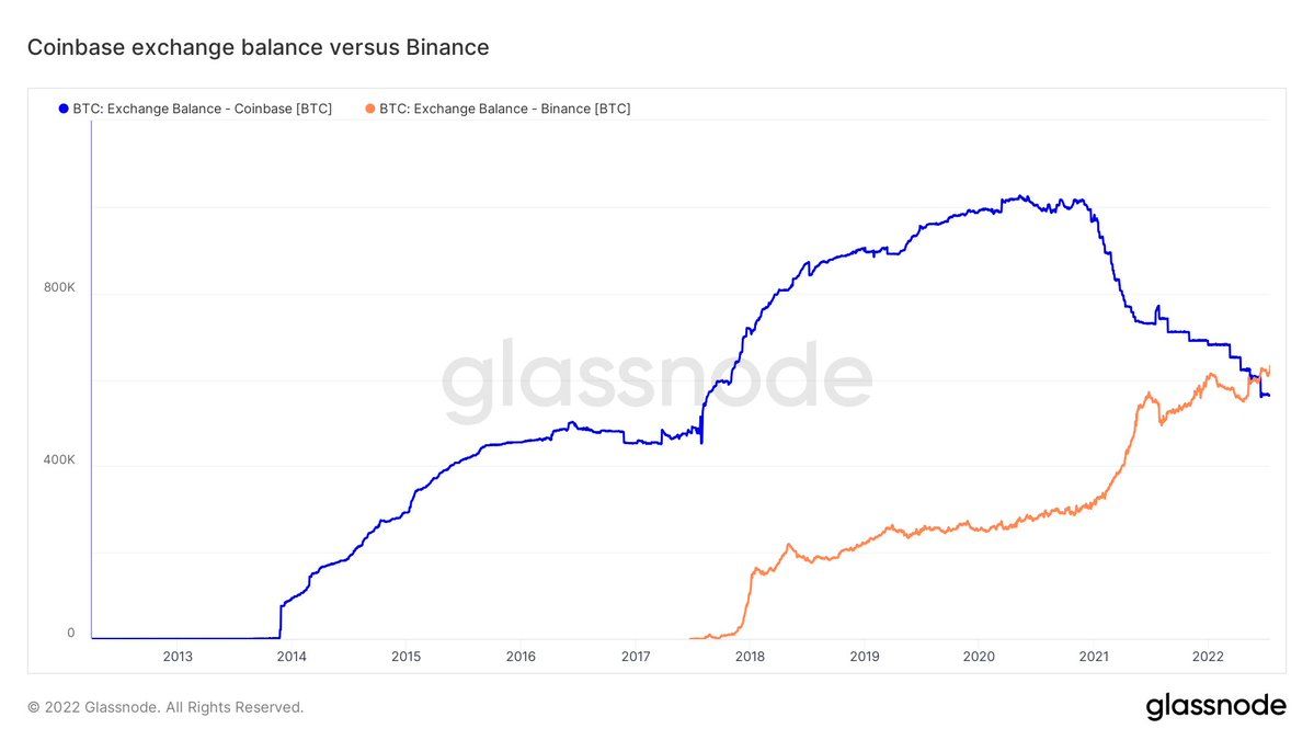 Le graphique de ci-dessous, issus des analyses de Glassnode fait état d’une passation de pouvoir qui s’est amorcée en 2021, alors que les entrées vers Binance ont été très importantes.