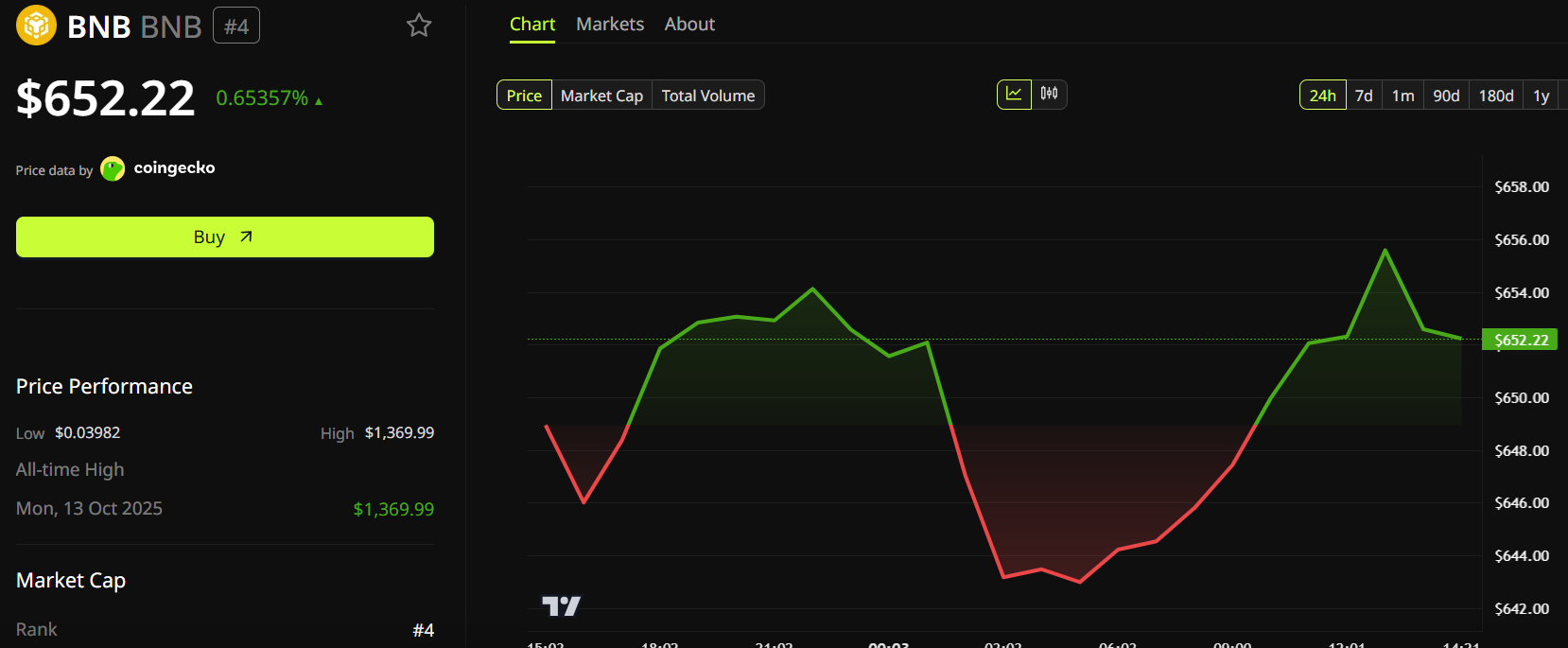 Malgré la nouvelle, le cours du token BNB de Binance n’a progressé que modestement de 0,65 % et s’échangeait à 652,22 $ au moment de la rédaction de cet article.