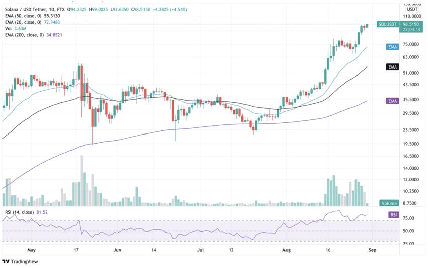 Solana (SOL), une blockchain programmable rapide qui exécute diverses applications décentralisées, poursuit sa croissance impressionnante avec un rendement de 30% au cours de la semaine dernière. La capitalisation boursière de SOL s’élevait à plus de 28,5 milliards de dollars au moment de la publication, passant à la huitième place dans le classement des capitalisations boursières crypto.