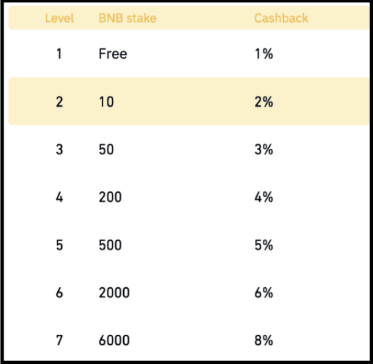 La carte Binance Visa offre également un cashback pour chaque achat effectué avec la carte. Le pourcentage de remboursement dépendra du niveau de votre carte, qui est basé sur le montant de BNB détenu.