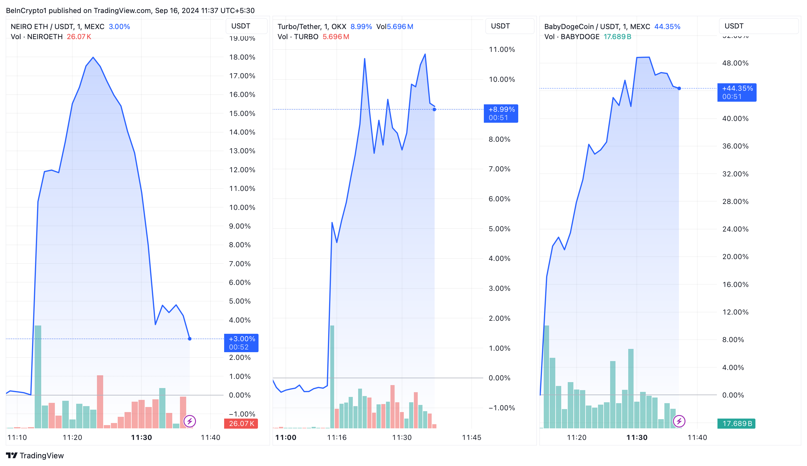 Après leur inscription, la valeur de Neiro a grimpé de 18 % presque immédiatement, bien qu’elle se soit ensuite stabilisée à un gain modeste de 3 %. En revanche, Turbo a su maintenir une hausse constante de 9 %. Baby Doge Coin, cependant, a montré la croissance la plus spectaculaire, s’envolant de plus de 48 % après l’annonce et conservant toujours une forte hausse de 44 % au moment de la rédaction de cet article.