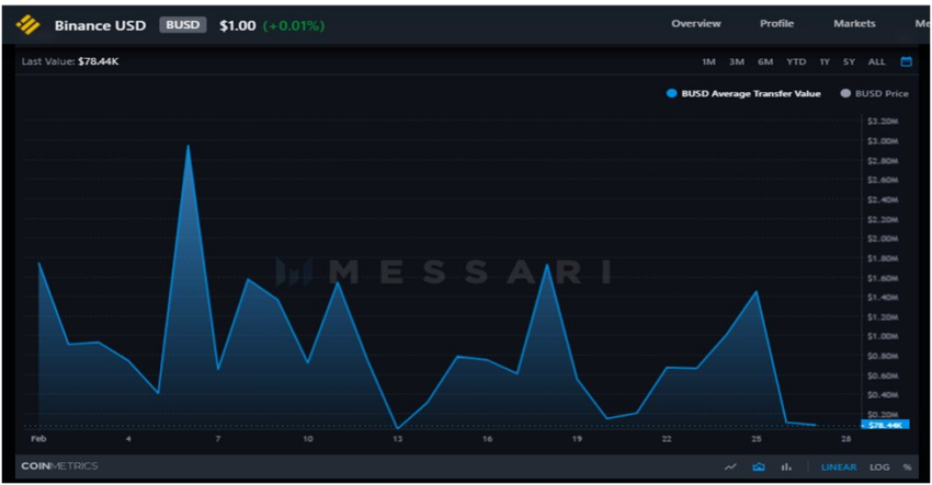 Bien qu’USD Coin ait enregistré en février un nombre total de transactions supérieur de 4 900% à celui du stablecoin de Binance, la valeur moyenne de ses transactions était relativement plus faible.