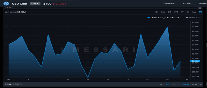 SponsoredLes perspectives baissières du marché ont ainsi entraîné un pic de la demande pour les stablecoins. À la fin de cette même journée, le nombre respectif de transactions pour l’USDC et le BUSD était de 74 568 et 1 388. Bien entendu, cela a entraîné une valeur transactionnelle moyenne de 150 000 $ sur la journée pour l’USDC, comme illustré ci-dessous.