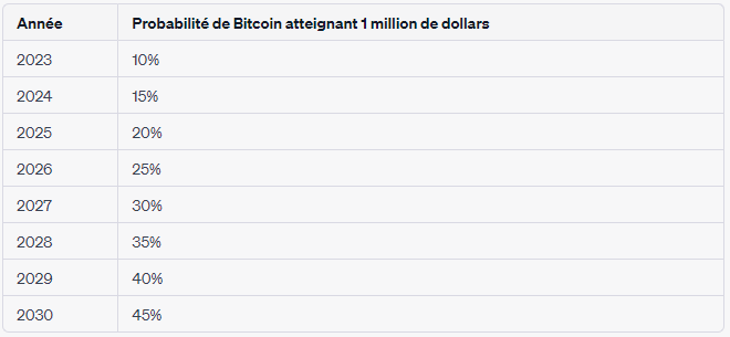 Année après année, la probabilité d’atteindre ce prix augmente d’environ 5 %. Mais sur aucune année, la probabilité dépasse les 50 %. Ainsi, même si 2025-2030 est à surveiller, il y a moins d’une chance sur deux par année que Bitcoin se retrouve à 1 000 000 de dollars.