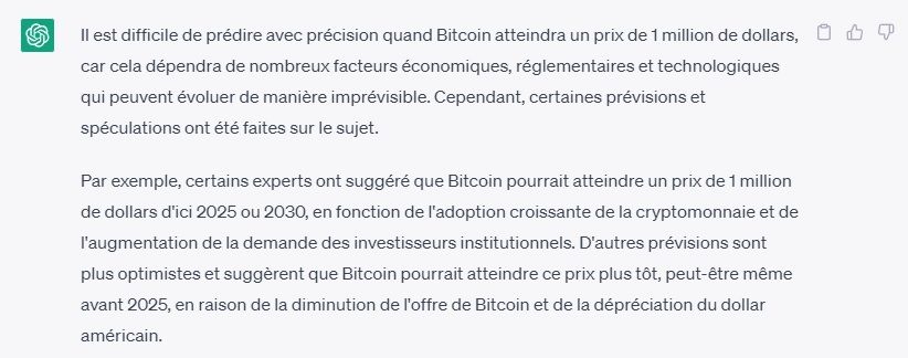Cependant, l’intelligence artificielle fait également preuve de réticence dans ses prédictions. En effet, ChatGPT ne garantie pas forcément que ce prix pourrait être atteint d’ici 2030. D’ailleurs, le produit d’OpenAI, met l’accent sur les facteurs imprévisibles qui pourraient se présenter au cours des prochaines années.