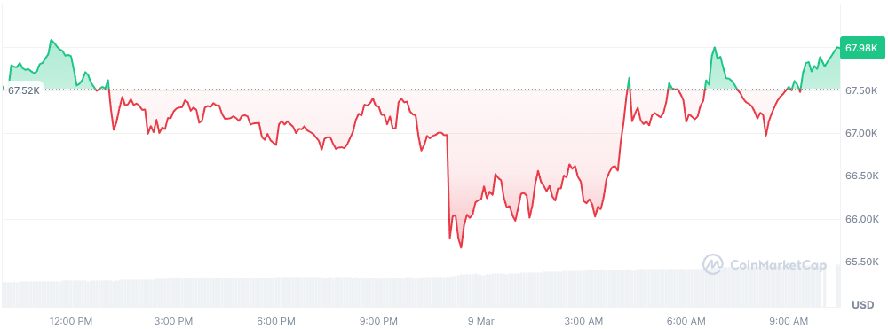 Tandis que le KOSPI sud-coréen s’effondre de plus de 9 % et déclenche une suspension automatique des échanges, le cours du BTC évolue dans le vert. La journée a vu Bitcoin progresser jusqu’à 67 600 $ et les acheteurs tentent désormais de consolider un support, signe d’un marché encore hésitant.