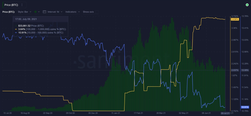 Cependant, Santiment a également noté que les adresses détenant entre 10 000 et 100 000 BTC étaient descendues à leur niveau le plus bas en date, avec 10,91% de l’offre détenue.