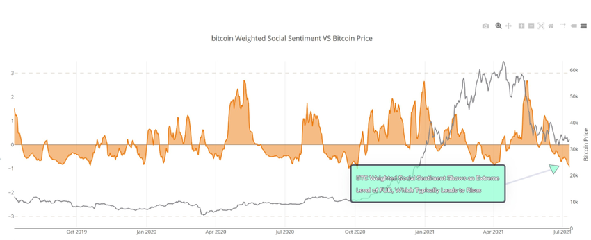 Bien qu’il semble que les gros détenteurs de bitcoins continuent d’accumuler les BTC, Santiment a également déclaré que “le sentiment actuel sur Bitcoin reste à des niveaux négatifs extrêmes, et que notre algorithme n’a pas observés depuis octobre 2020. Si le BTC varie encore longtemps, le sentiment négatif dépassera probablement cette valeur, ce qui en fera le niveau le plus baissier depuis juin 2018.”