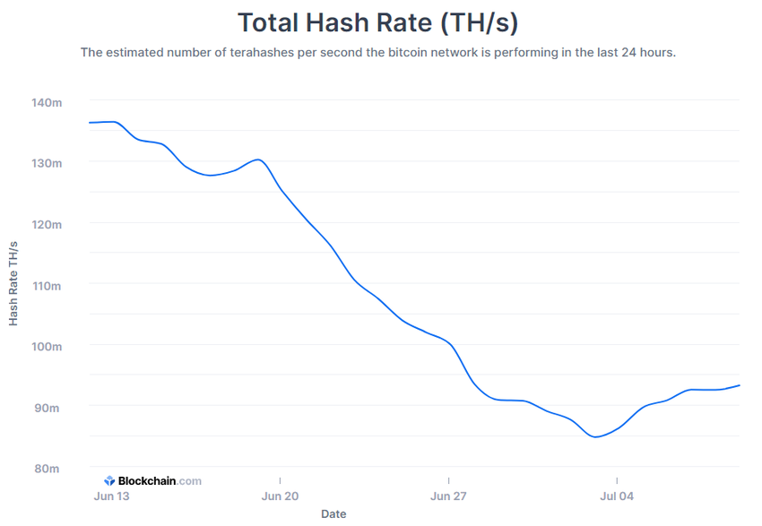 Les opérations minières semblent reprendre lentement, le taux de hachage total ayant grimpé de 84,79 TH/s la semaine dernière à 93,24 TH/s ce dimanche 11 juillet.