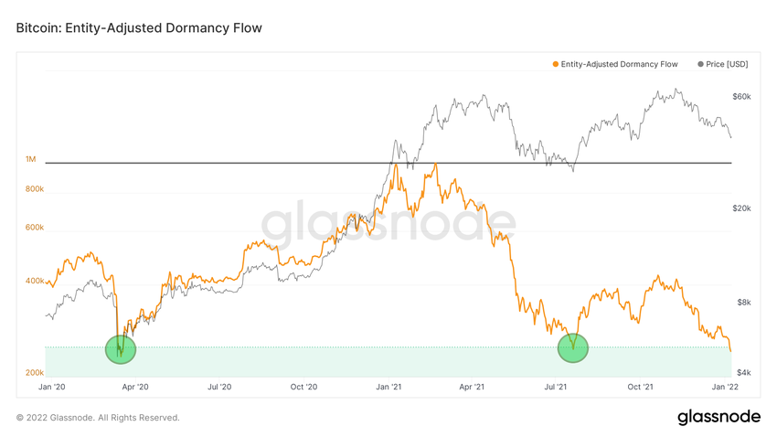 La valeur actuelle du flux de dormance ajusté par l’entité vient d’entrer dans la zone verte et se situe aujourd’hui à 242 000 $. En dehors du moment présent, cette zone n’a été atteinte que deux fois par le marché de Bitcoin au cours des deux dernières années (cercles verts).