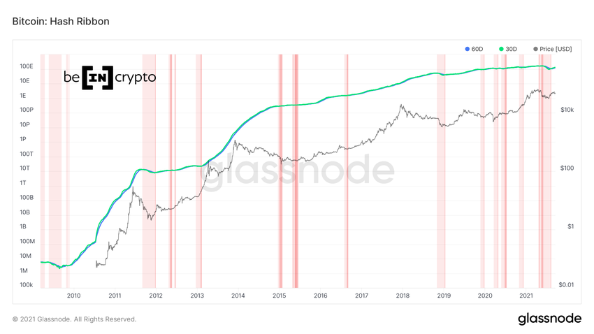 Les indicateurs utilisent également une MA sur 30 et 60 jours pour le taux de hachage, ce afin de déterminer quand à quelle moment ces périodes de capitulation prennent fin.