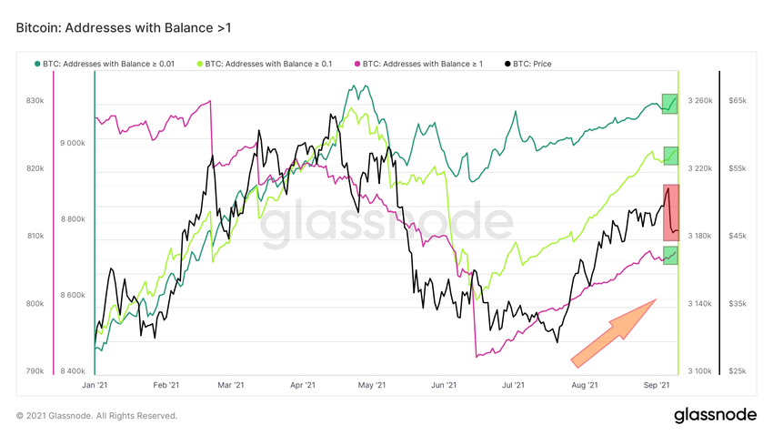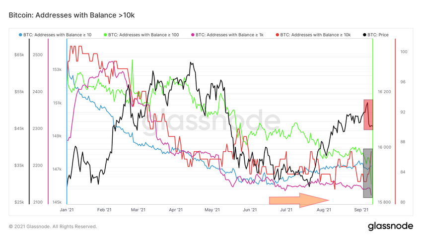 On y voit une poursuite claire du mouvement de hausse (rectangles verts) malgré la chute du cours de Bitcoin quelques jours plus tôt (rectangle rouge). Ainsi, le nombre de petites positions est en hausse au moins depuis la consolidation du cours de mi-mai/juin 2021 (flèche orange). Le récent crash éclair du cours n’a fait que renforcer cette tendance.