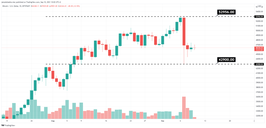 La semaine dernière, au 7 septembre, Bitcoin a atteint un sommet local à 52 956 $, juste au-dessus du niveau de retracement de Fibonacc 0,618. Le même jour, un crash éclair a fait chuter le cours à 42 900 $. L’une des raisons de cette baisse de 19 % a été la liquidation des positions longues à effet de levier, qui se sont élevées à un total de 4 milliards de dollars.