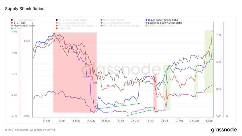 Les positions des investisseurs à long terme de Bitcoin sont restées inébranlables malgré la forte baisse du 7 septembre. Nous continuons également à observer une aggravation du choc de l’offre, la quantité de BTC présents sur les exchanges diminuant constamment.