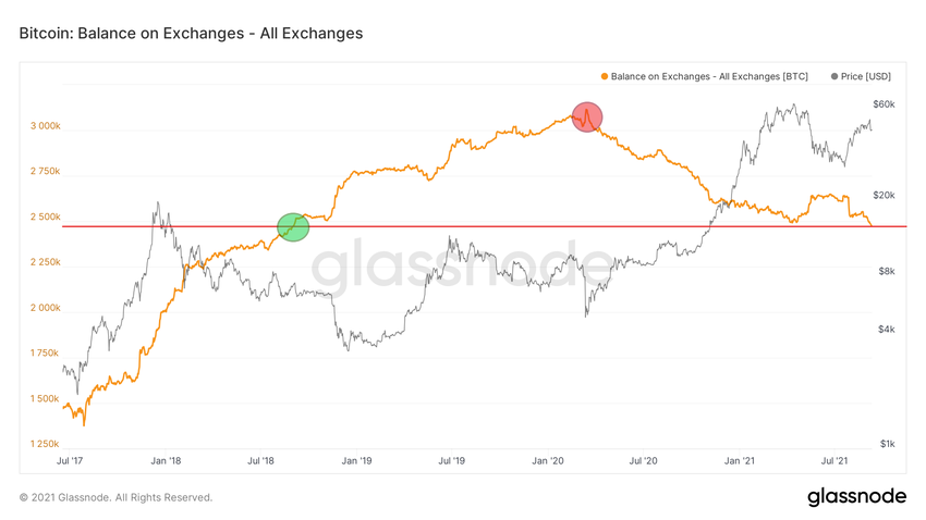 Les deux seules hausses significatives des soldes de BTC sur les exchanges au cours de cette période ont été observées lors des hausses du cours de Bitcoin en juillet 2020, et surtout lors de sa récente baisse en mai 2021. Par ailleurs, la quantité de BTC disponibles sur les exchanges vient d’atteindre son niveau le plus bas depuis 3 ans. La dernière fois que les exchanges ont enregistré une offre aussi faible remonte à fin août 2018 (cercle vert), lorsque Bitcoin s’échangeait à environ 7 000 dollars.