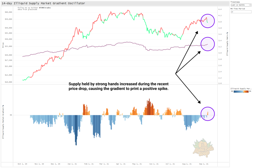 Les observations de Willy Woo sont confirmées par un autre analyste on-chain @TXMCtrades. Ce dernier a notamment attiré l’attention sur l’indicateur 14-day Illiquid Supply Market Gradient [gradient de marché de l’offre illiquide sur 14 jours]. Cet indicateur sert à estimer le moment où des investisseurs à long terme et aux avoirs importants maintiennent leurs positions plus fermement que ce qu’indique l’action des cours.