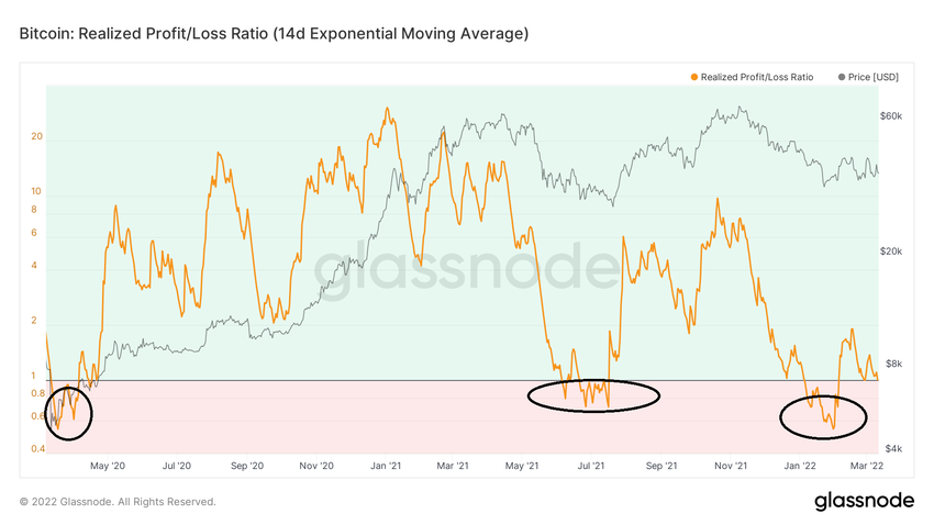 Les pertes réalisées indiquent le montant total des pertes en USD de tout le Bitcoin qui a été vendu dans le rouge. L’indicateur a atteint un pic en mai 2021, s’élevant à plus de 1,5 milliard de dollars (cercle rouge) lorsque Bitcoin s’échangeait à 34 000 dollars. Ces pertes ont probablement été causées par des vendeurs qui avaient acheté l’actif près de son prix record de 63 000 $ en avril.