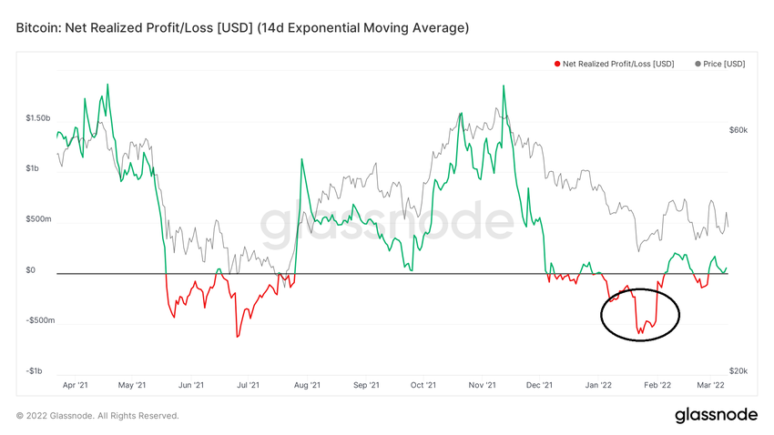 Les profits réalisés ont atteint un pic de plus de 3 milliards de dollars en janvier 2021 (cercle noir), ce au cours record de l’époque, qui s’élevait à 40 400 dollars. Ensuite, les profits réalisés sont descendus à leur niveau le plus bas de 230 millions de dollars en juillet 2021, ce tout près du plancher local du BTC (cercle rouge).