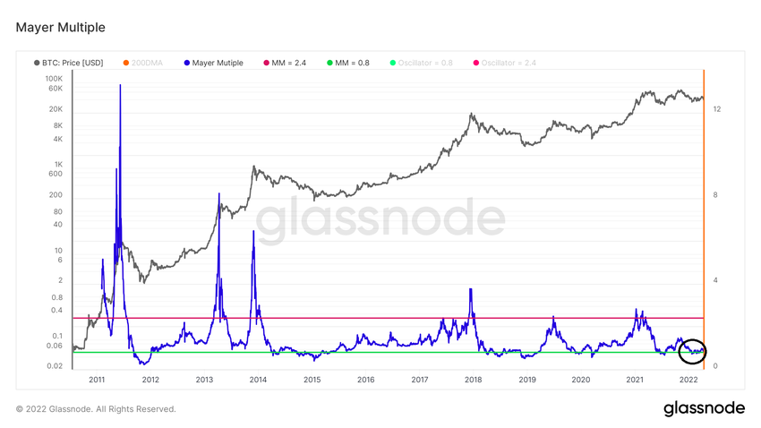 Pour conclure, le multiple de Mayer a regagné l’oscillateur de 0.8 après être initialement passé sous ce dernier. Historiquement, cela a constitué un signe de plancher du marché Bitcoin?