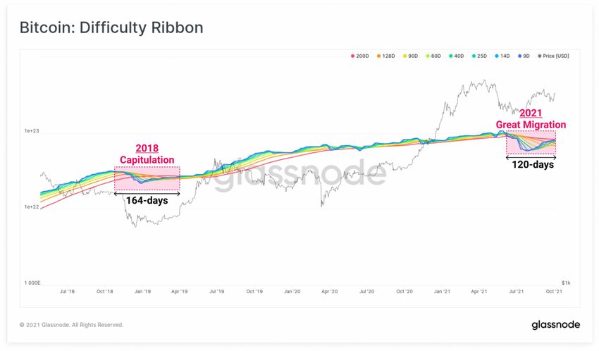 L’indicateur du ruban de difficulté (Difficulty Ribbon), créé par Willy Woo, utilise plusieurs moyennes mobiles (MA) de la difficulté du minage du BTC. La compression de ces rubans a historiquement représenté un bon signal pour acheter des bitcoins.