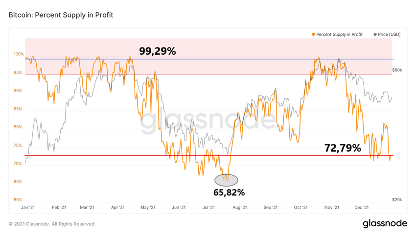 Cependant, la chute ultérieure du cours du Bitcoin a été suivie d’une forte réduction de l’offre en profit. Au moment d’atteindre le plancher de l’été, seuls 65,82 % des bitcoins étaient en situation de profit (zone grise). Ensuite, le graphique s’est à nouveau déplacé vers le haut pour s’approcher des 100% près de l’ATH de novembre.