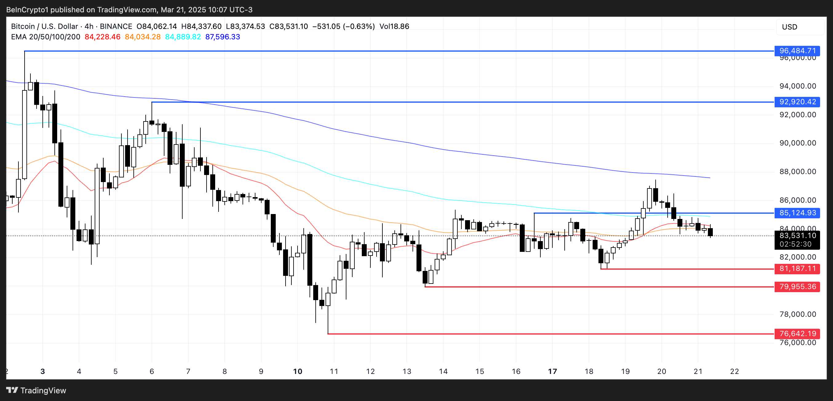 Le cours du Bitcoin se consolide actuellement entre une résistance à 85 124 $ et un support à 81 187 $, avec ses lignes EMA montrant un manque de direction claire. Le récent pic de cours suite à la réunion du FOMC a rapidement perdu de la vigueur. C’est notamment ce que montrent les analyses de Nic Puckrin, qui suggèrent que le rallye pourrait être de courte durée en fonction des conditions actuelles du marché :