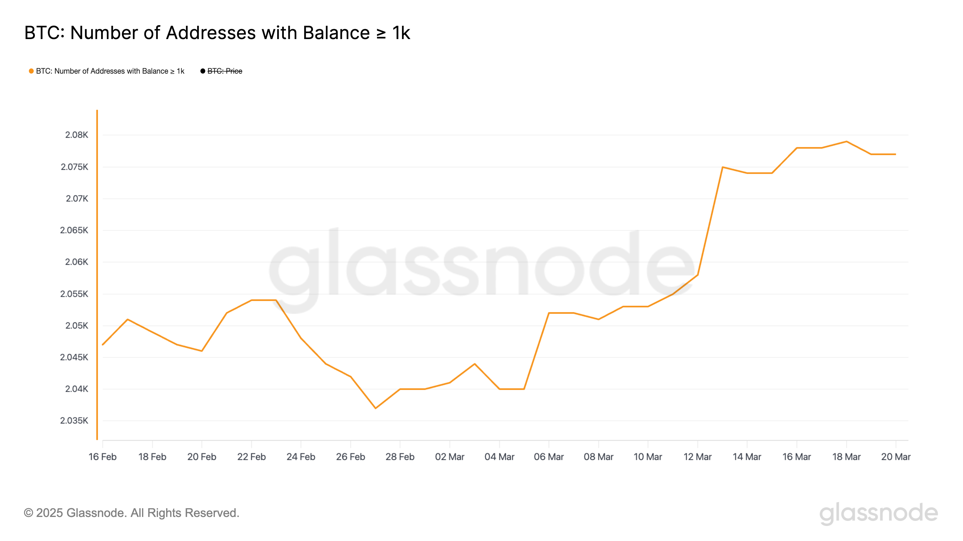 Le nombre de baleines Bitcoin a récemment augmenté, avec des portefeuilles détenant au moins 1 000 BTC qui sont passés de 2 040 à 2 079 entre le 5 et le 18 mars. Cette valeur est la plus élevée depuis la mi-décembre 2024.