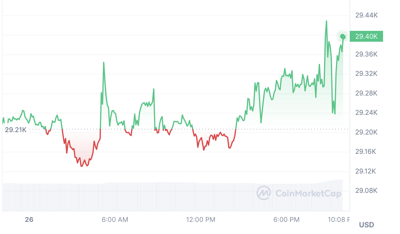 Au moment de rédaction, Bitcoin affiche une légère hausse de 1,46 % à 29 600 $, tout comme le S&P 500 qui est en recul de 0,18 %. L’indice technologique du Nasdaq n’a pas connu de mouvements significatifs pour le moment, se maintenant à 14 141,42 points.