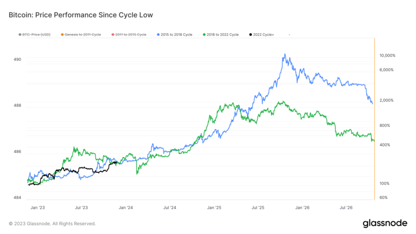 L’action du cours de Bitcoin semble être parallèle aux cycles de marché précédents. En effet, selon Ali Martinez, responsable mondial des actualités chez BeInCrypto, le BTC pourrait refléter le cycle haussier observé entre 2015 et 2018, ainsi que celui de 2018 à 2022.