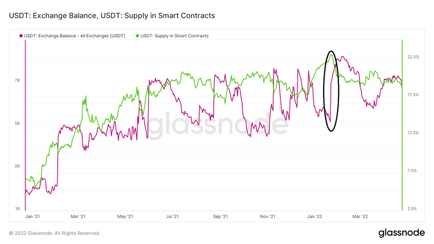 Il est intéressant de constater que depuis janvier 2022 (cercle noir), le solde d’USDT sur les exchanges a augmenté, tandis que l’offre verrouillée dans les contrats intelligents (en vert) a diminué.