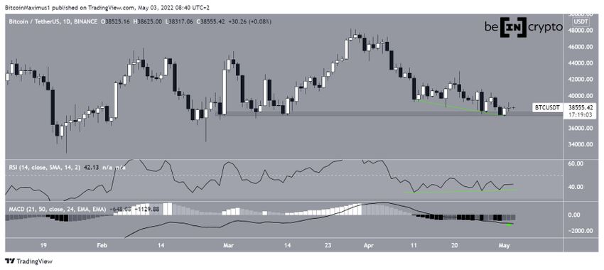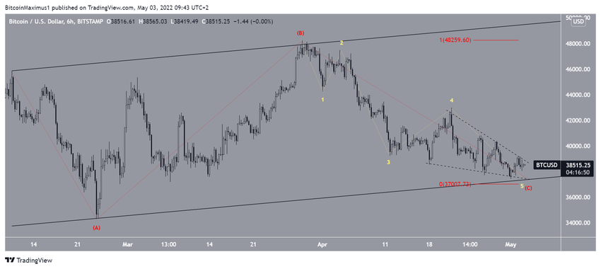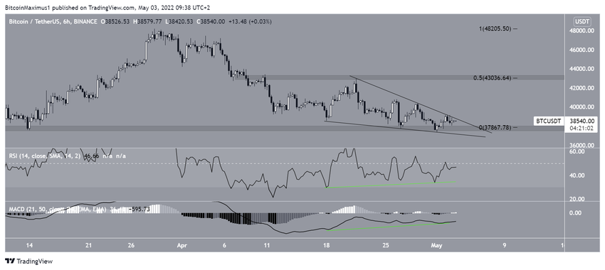 Le BTC évolue à l’intérieur d’un biseau descendant depuis le 18 avril. Les figures de biseau sont souvent considérées comme des schémas haussiers, ce qui signifie qu’elles conduisent à des avancées du cours la plupart du temps.