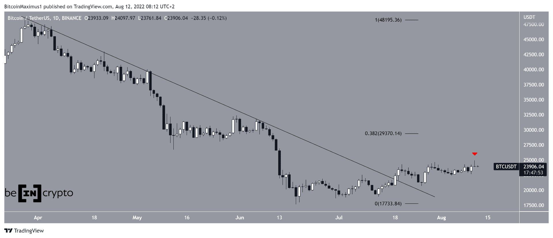 Ce jeudi 11 août, le BTC a atteint un sommet local de 24 918 $, le plus élevé depuis le 12 juin. Cependant, il n’a pas réussi à maintenir cette hausse et a ensuite créé une longue mèche supérieure au sein de son chandelier quotidien (flèche rouge).