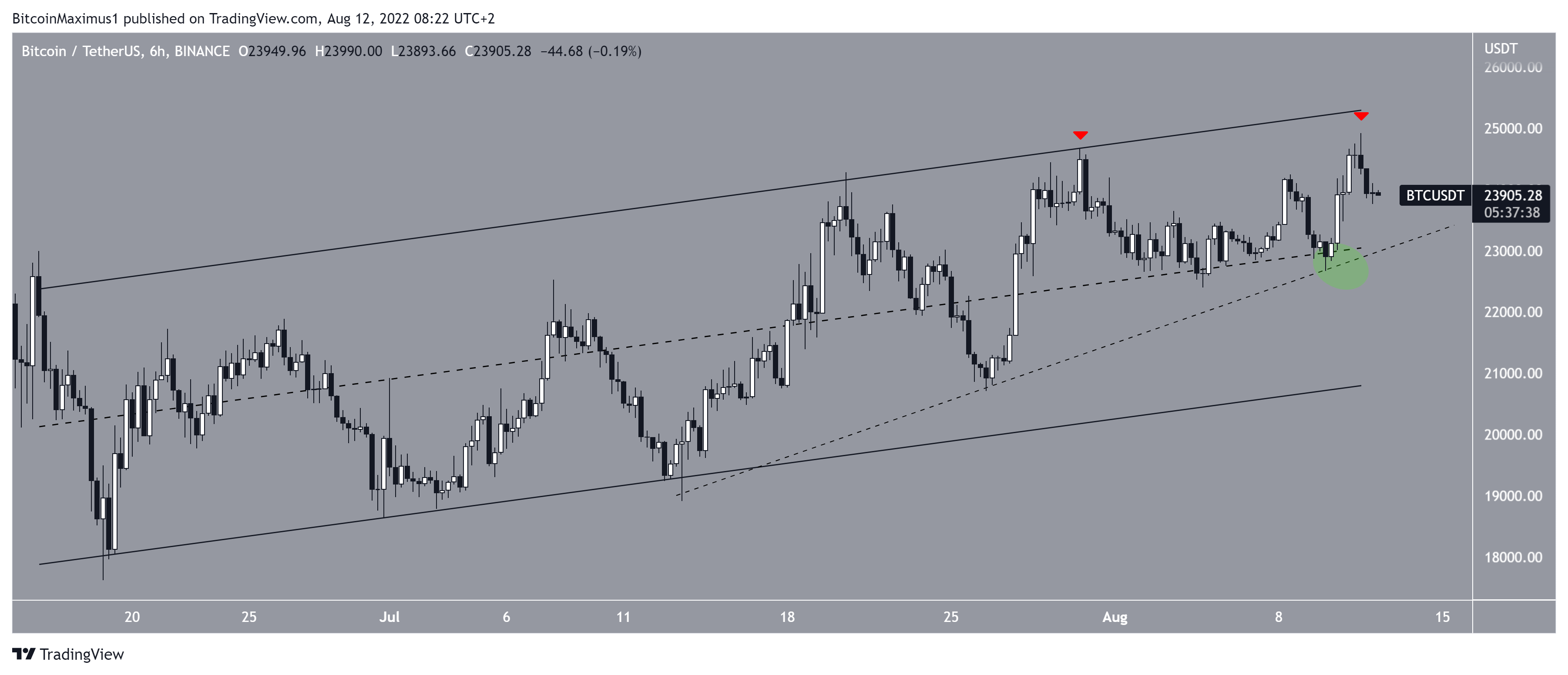 Le 9 août (cercle vert), le BTC a rebondi à la ligne médiane de ce canal, ainsi qu’à une ligne de support ascendante de court terme.