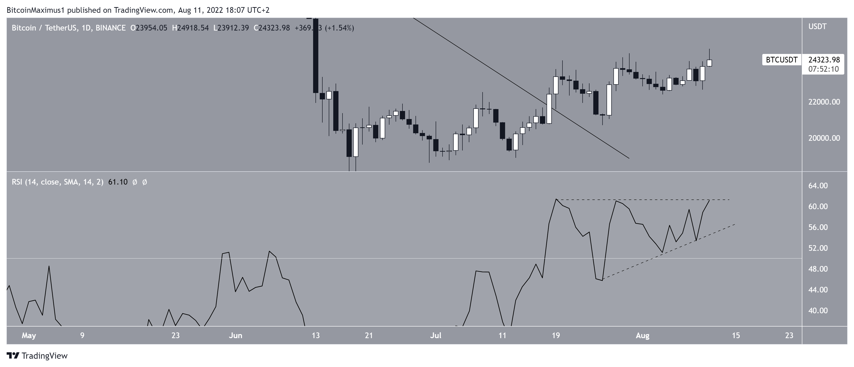 On trouve une lecture intéressante dans le RSI quotidien, lequel a dépassé la zone des 50 au moment où le BTC a dépassé sa ligne de résistance descendante.