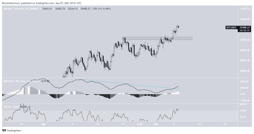 De même que pour les données journalières, le graphique sur six heures montre un passage du BTC au-dessus de la ligne de tendance de la divergence baissière, cette fois au sein de la MACD plutôt que du RSI. Ce dernier vient de passer au-dessus de 70, ce qui peut être interprêté comme un autre signe de force.